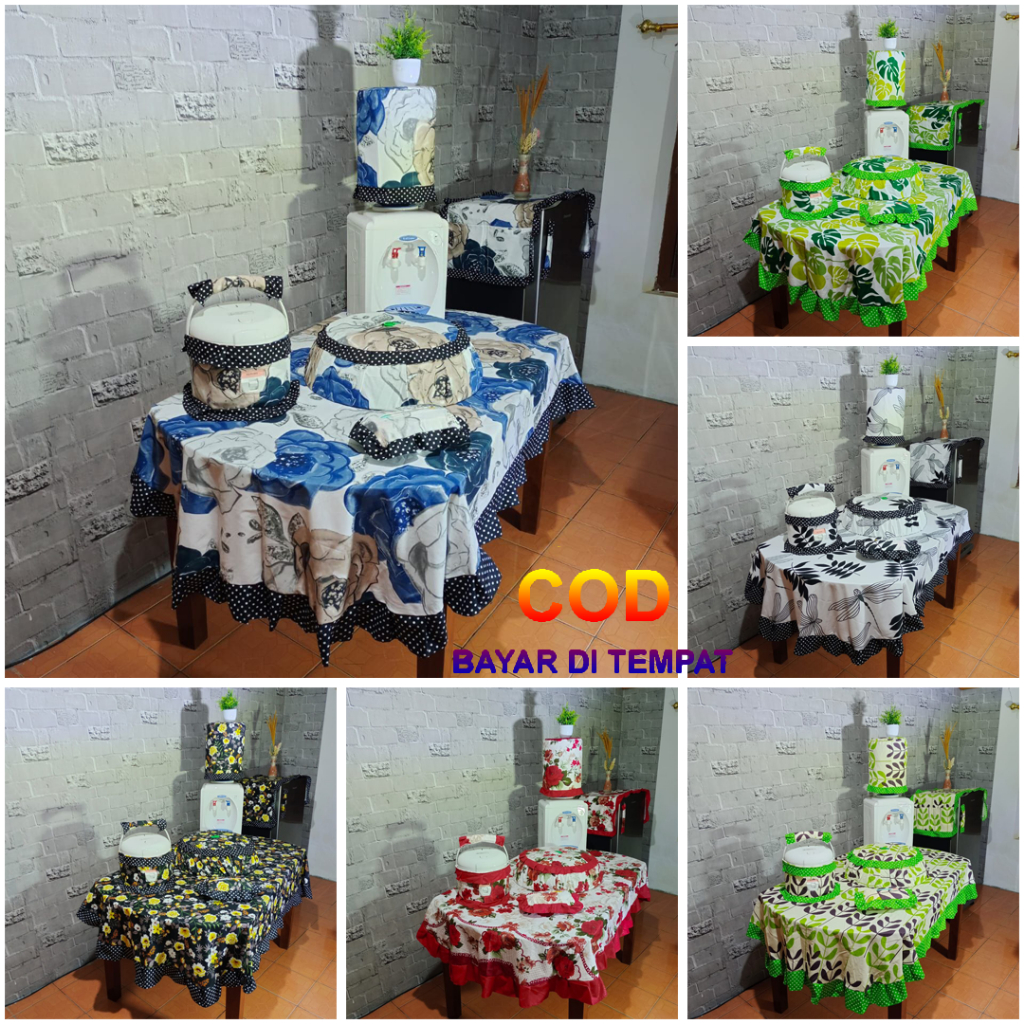 Isi paket yang akan anda dapatkan, Sebagai berikut : * 1 Taplak Meja Makan Oval (Jumbo) * 1 Sarung Galon Multifungsi * 1 Taplak Kulkas * 1 Sarung Mejikom * 1 Sarung Tudung Saji Bulat (Jumbo) * 1 Sarung Tempat Tisu * 1 Sarung gagang pintu kulkas * 1 Sarung gagang tutup magicom