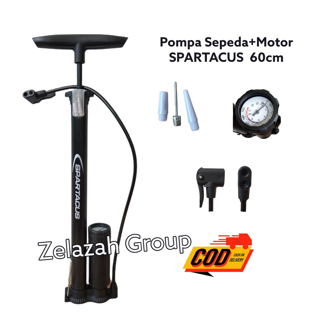 POMPA BAN MANUAL DENGAN TABUNG METER Merk SPARTACUS Deskripsi Produk : * Tinggi pompa : -+ 60 cm * Pompa ban serbaguna untuk sepeda, motor, mobil, balon, bola, dll * Dilengkapi pentil bola dan dua adaptor * Body bahan ABS(Campuran Besi dan Plastik jadi lebih kuat) * Gagang dan alas Pompa dari bahan ABS * Genggaman kuat dan lebar, sangat ringan ketika memompa dan nyaman * Dilengkapi dengan tabung udara sehingga tidak memerlukan tenaga berlebih saat memompa ( Enteng ) * Ada pijakan dan barometer pengukur tekanan ban