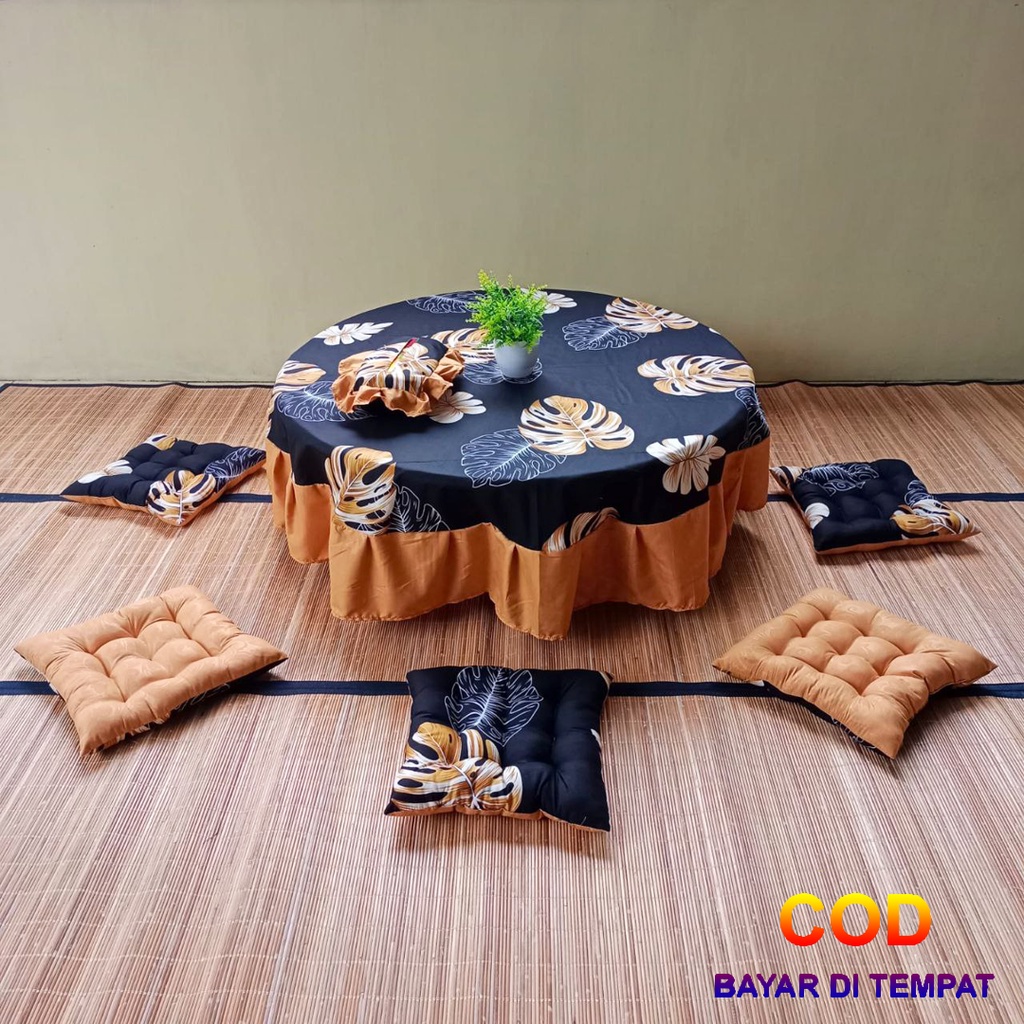 Spesifikasi umum : * Produk : Taplak Meja Set Bantal Duduk Tempat Tisu * Total produk : 7 Pcs (5 Bantal Duduk, 1 Taplak Meja Bundar, 1 Tempat Tisu)