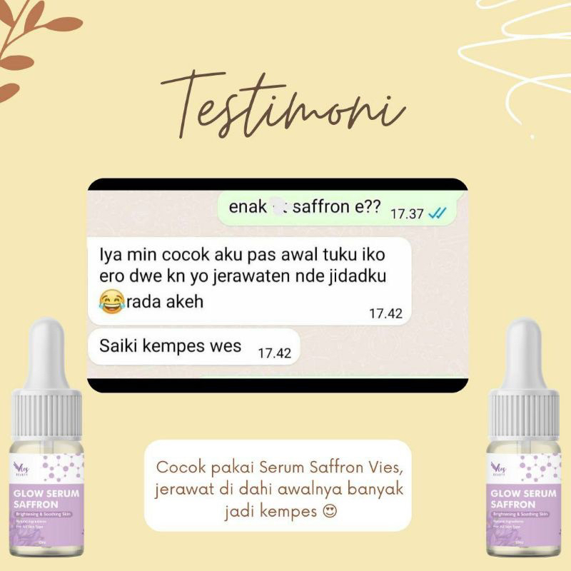 Glowing Serum Saffron Vies memiliki bahan-bahan alami secara ampuh dapat mencerahkan kulit wajah. Bahan-bahan aktif tersebut seperti Aloevera, Vitamin C & Vitamin E bagus dalam perawatan kulit dan menjadikan kulit lebih lembab, cerah, dan dapat menyamarkan noda hitam dari bekas jerawat.