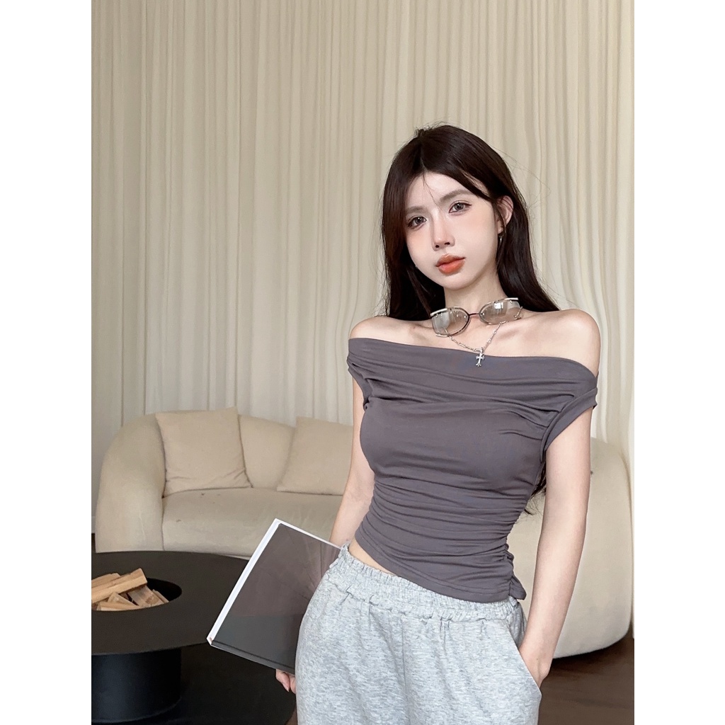 ◎☍۩#COD Suhao hot girl one-shoulder lengan pendek t-shirt wanita musim panas off-the-shoulder lipatan seksi desain chic atasan pendek