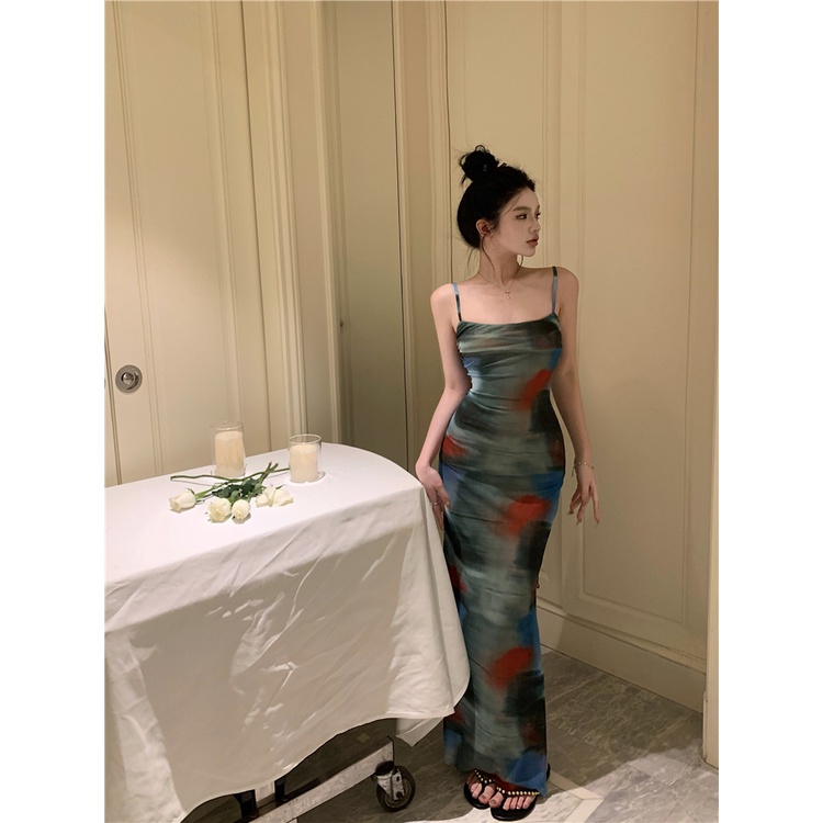 Pakaian Wanita > Atasan > Kaus > ✹#COD Suhao Keinginan Murni Gaya Suspender Gaun Wanita Musim Panas Rok Panjang Tie-Dye Rasa Maju Retro Panas Gadis Pinggang Seksi Tas pinggul Rok