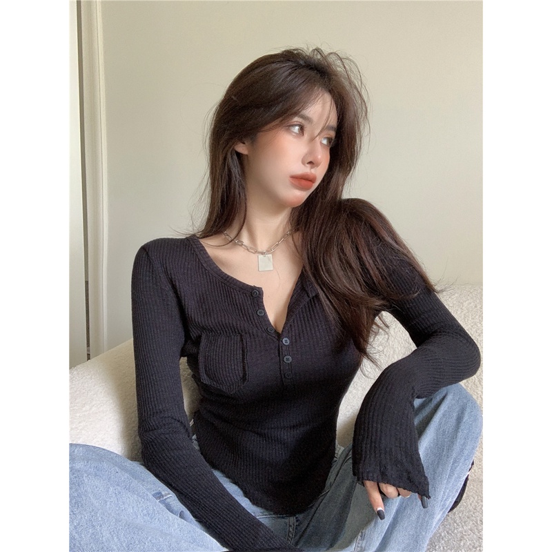 Pakaian Wanita > Atasan > Kaus > ♤#COD Suhao Rajutan T-shirt Wanita Musim Semi 2023 Baru Pendek V-Leher Ketat Bagian Dalam Kemeja Putih Atasan Lengan Panjang
