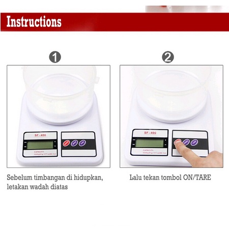 Electronic Kitchen Scale model SF400 10Kg * Berteknologi "High Precission Strain Gauge", * Kapasistas sampai : 10.000 gram (10kg) * Tampilan LCD dengan angka yang besar sehingga mudah terbaca. * Power: 2 x Baterai AA 1,5 volt (sudah termasuk) * Overload / Low battery indicator * Auto zero resetting