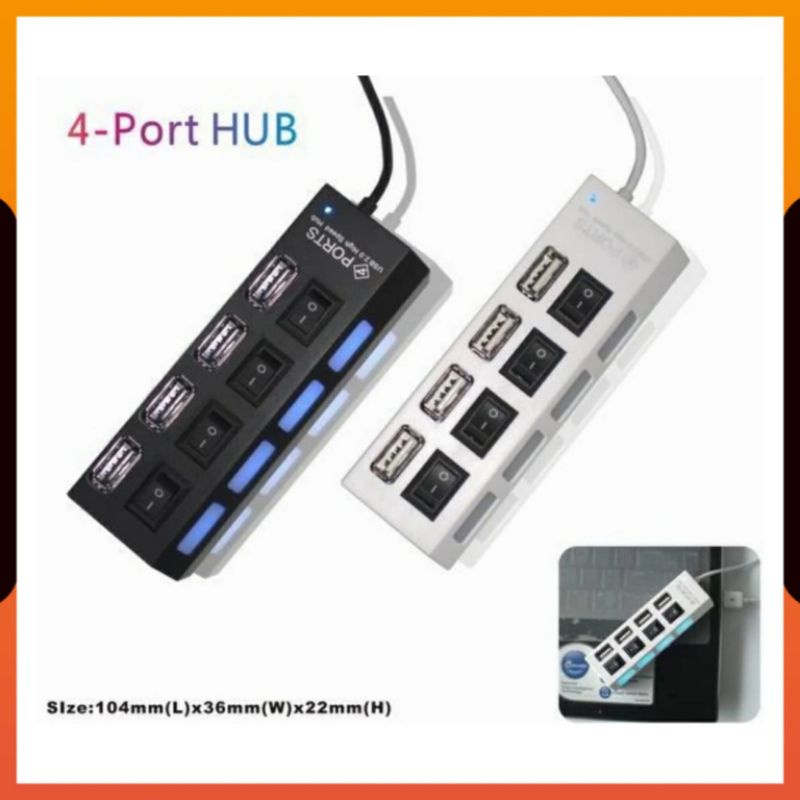 4 USB Hub dengan tombol on / off pada masing2 nya. Dengan LED berwarna biru sbg indikasi power Cable Length : +/- 70 Cm Color: hitam/putih klo ga ready warna yang di minta kita kirim warna yang ready gan thank you Nett Weight: 90 Gram Plug and Play