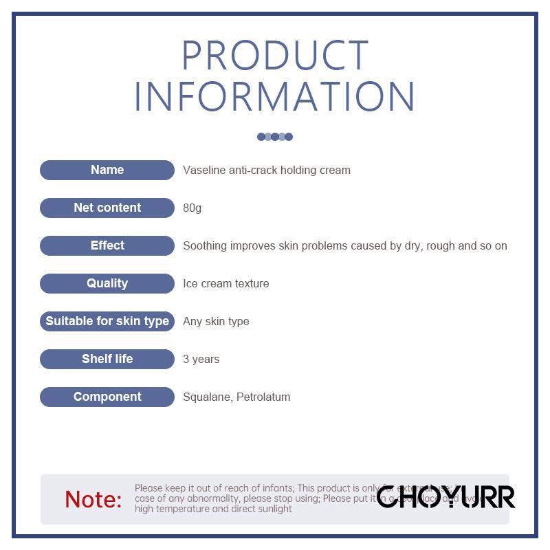 Fitur Anti Retak, Melembabkan Luar Biasa, Anti Kering, Anti Beku, Tekstur Bening, Bergizi, Tahan Lama Formula Alami: Formula alami dikombinasikan dengan faktor pelembab dapat dengan cepat melembabkan dan memperbaiki kulit pecah-pecah. Squalane, melembabkan, tembus cahaya dan lembut; Petrolatum, lembut, dekat dengan sebum manusia, cepat menyatu dan menyerap dengan baik. Efek: Mengandung bahan-bahan Vaseline, menenangkan dan memperbaiki masalah kulit kering, kasar dan lainnya, mengangkat kulit, dan menghadirkan kulit yang lembut dan terawat Tingkatkan Elastisitas Kulit: Tingkatkan elastisitas kulit dengan faktor pelembab untuk menghilangkan garis-garis kering dan meningkatkan kehalusan kulit.