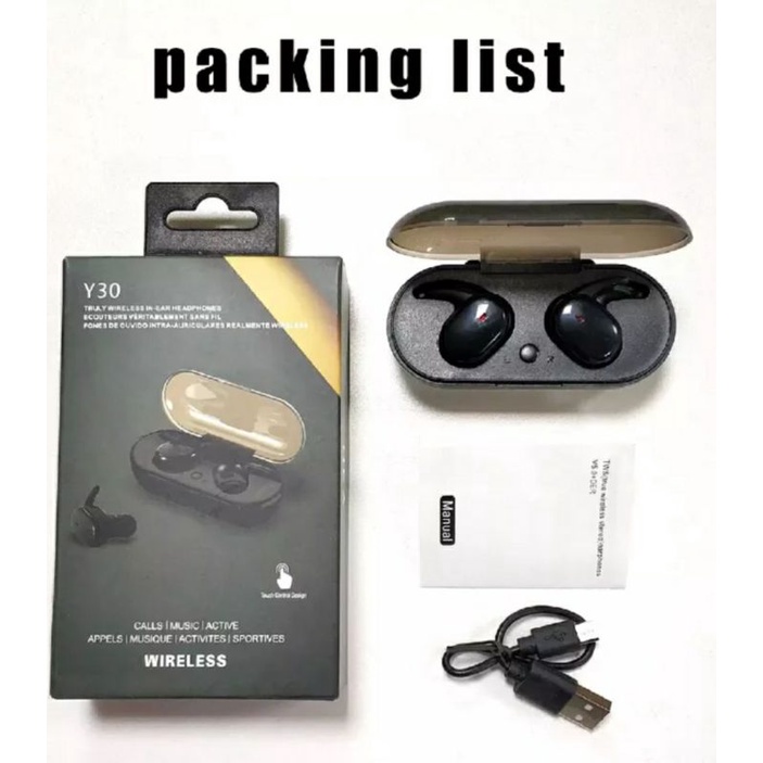 Deskripsi Produk : Y30 Wireless Earphones Bluetooth 5.0 Stereo Earbuds Headset High-speed Data with Microphone for iOS Android Color: black Material: ABS Bluetooth version: dual mode wireless 5.0+EDR, ultra low power consumption Headphones program: Jerry 6939 Protocol mode: A2DP, AVRCP, HSP, HFP Wireless use frequency band: 2.4Ghz Effective distance: 10m or more Binocular pairing mode: automatic pairing after booting Horn diameter: 8mm Impedance: 32Ω Sensitivity: 42db Distortion: ±5% Battery capacity: Headphones 55mAH Charging bin: 450mAH Headphones music time: 3-4 hours Headphone talk time: 4-5 hours Waterproof rating: IPX4 waterproof Battery compartment charging interface: micro USB Charging time: 1 hour Charging box charging voltage: 5v