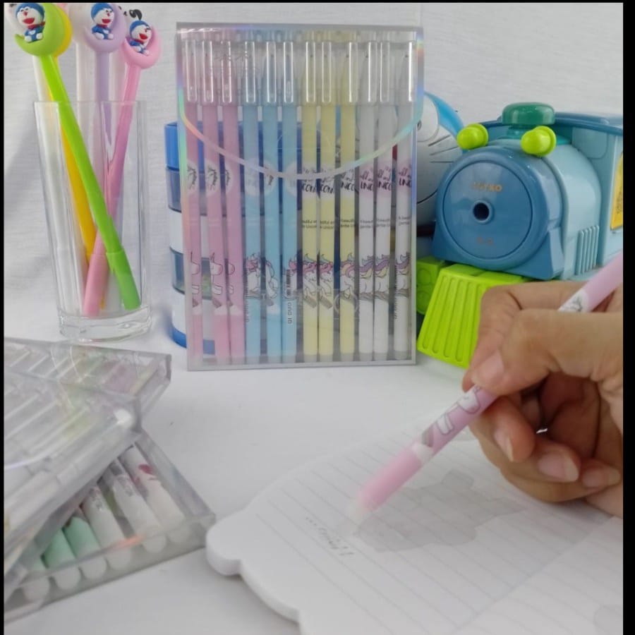 Pulpen tulis yang bisa dihapus kembali cocok disemua media tulis kertas untuk kantor dan sekolah, tinta berjenis Gel tidak perlu khawatir akan tulisan putus - putus.