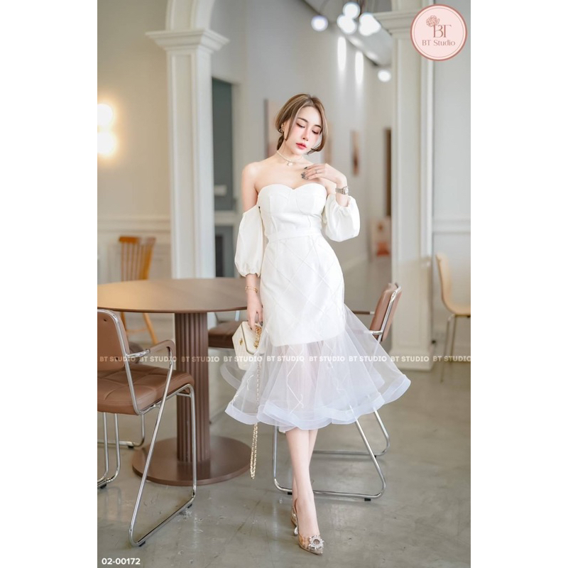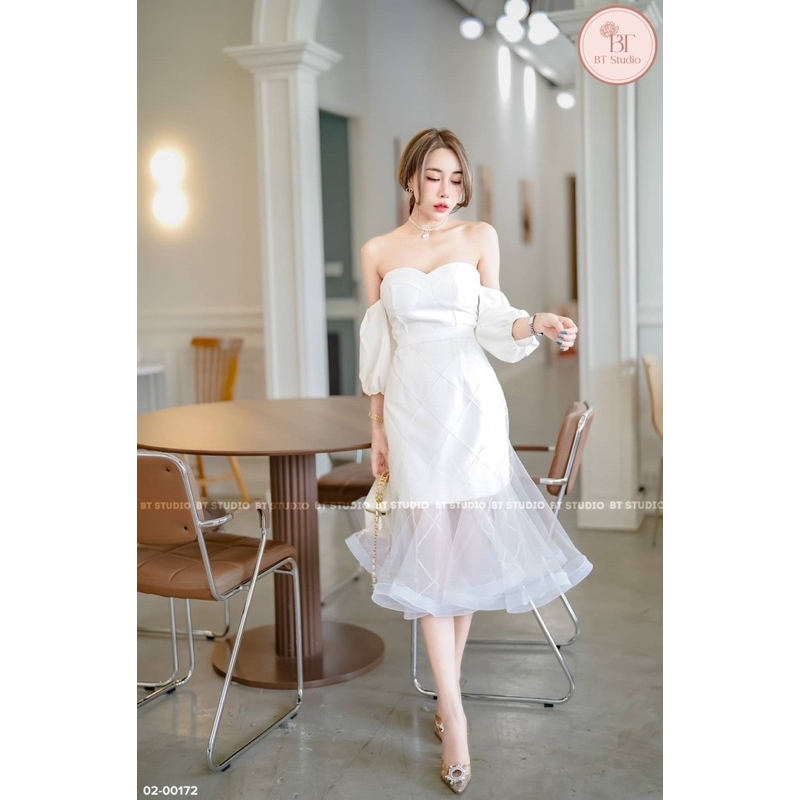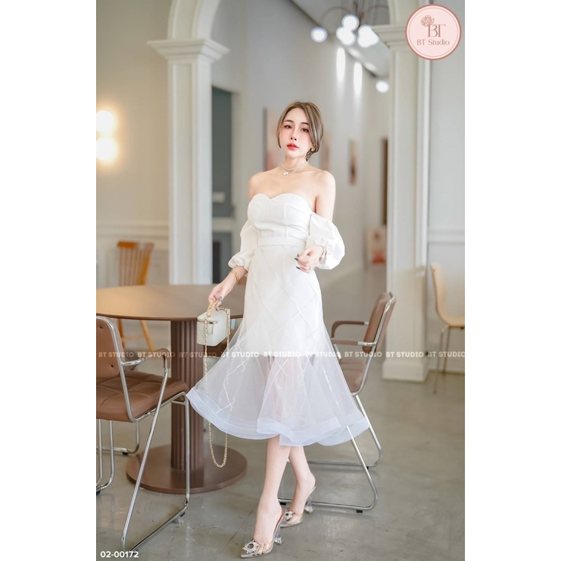 DETAIL: Set of 2 pieces, short dress, strapless, decorated with shoulder-baring sleeves, connecting both sides. Smocked sleeve ends The bust is decorated with almost the front and the back. Sponge chest, back zip, matched with a mesh skirt, drawstring, hem, flared, using a lot of fabric. Beautiful work, can be worn in 2 styles, good quality work, beautiful, perfect, don't miss it