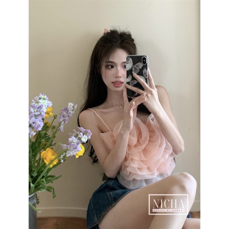 Crop top with net, pastel color, smocked back Very cute and comfortable to wear