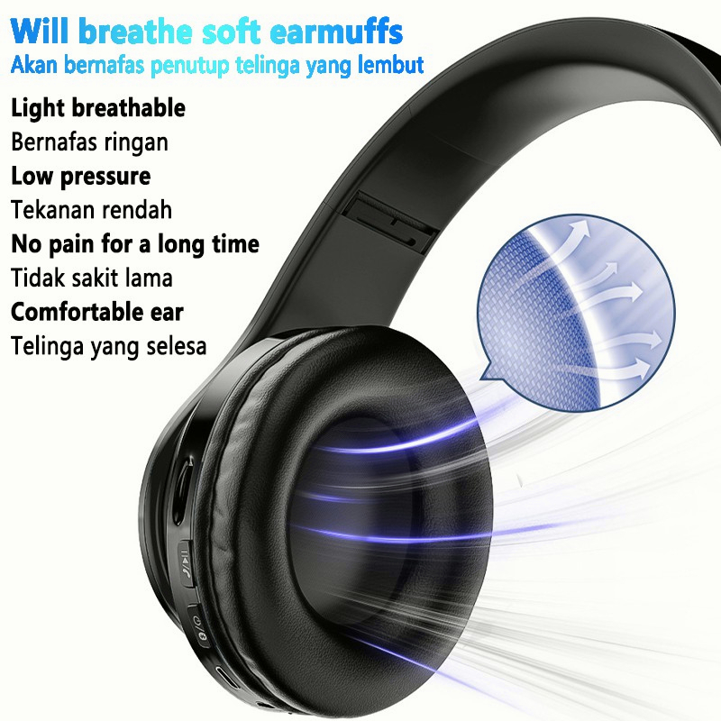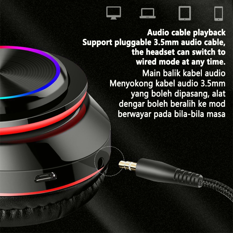 Mengapa Memilih Kami(Techno_shopp)? ✅【100% Ready Stock】 【Kapal Cepat 24 Jam, Waktu kedatangan rata-rata 1 ~ 3 hari setelah kapal!】 【Harga sangat rendah, Jaminan Kualitas】 📦【Periksa Dua Kali Sebelum dikirim, Kemasan Aman Features: 👍 HiFi Powerful Bass Stereo Sound Effect: 40mm diaphragm speaker drivers, deep bass stereo sound, enjoy the wireless high quality music 👍 Comfortable Over-Ear Fit: Soft protein leather earpad and retractable headband lifts the burdens for your ear. No discomfort after long-time wearing. 👍 Comfortable and Foldable: Technical ergonomics design with soft earmuffs simulated to human skin texture, ensure long lasting comfort 👍 Wireless and Lightweight: Ear Pad headphones for enjoying extended listening of TV and audio—without disturbing others 👍 Built in Microphone: supports hands-free call and voice reporting incoming call number. With the latest enhanced technology makes you voice sound clearer in noisy environments 👍 Ever Power Off, Both Wireless & Wired: 1. The wireless mode: A built-in 400mAh battery provides up to 10-hr music time or talking time in a single charge; 2. The Wired mode: you can also use it as a wired headphone with the provided audio cable so the headphones will never power off. 👍 Bluetooth 5.0: The Bluetooth 5.0 CSR Chipset, lower power consumption, superior compatibility. Compatible for all the mobile Phone, Tablet PC, Notebook, any devices with bluetooth function Or has A 3.5mm Audio Jack 👍 Multi-Functions: headsets have several options for listening enjoyment. Built in TF card slot and you can use a TF/Micro SD card with loaded MP3 music and listen to the songs directly on your headsets. 👍 Colorful LED Light: Seven-color transform cool breathing light, shine everywhere, anytime.