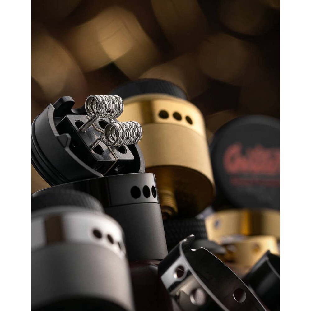 Features : - 24mm "postless" deck design - Fully gold plated positive/negative terminals - New anti-leak air flow control rings - 3/4 turn top for easy dripping - 810 drip tip - 510 Pin/Squonk pin Included - PEEK insulators - Custom Coilturd Coil Cutting Tool - Shoelace Cotton