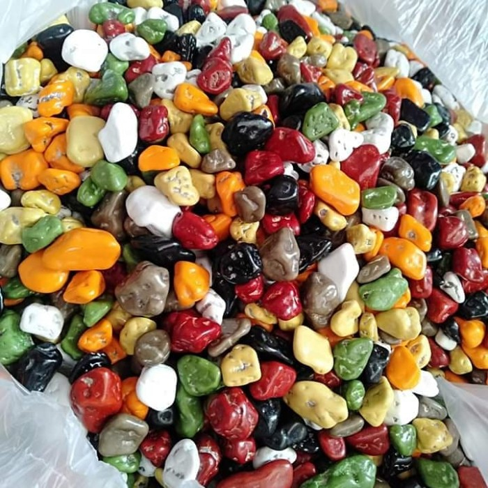 Cokelat manis unik khas Timur Tengah dengan rasa yang renyah , lezat & crunch berbentuk kerikil berwarna-warni mirip batu akuarium.