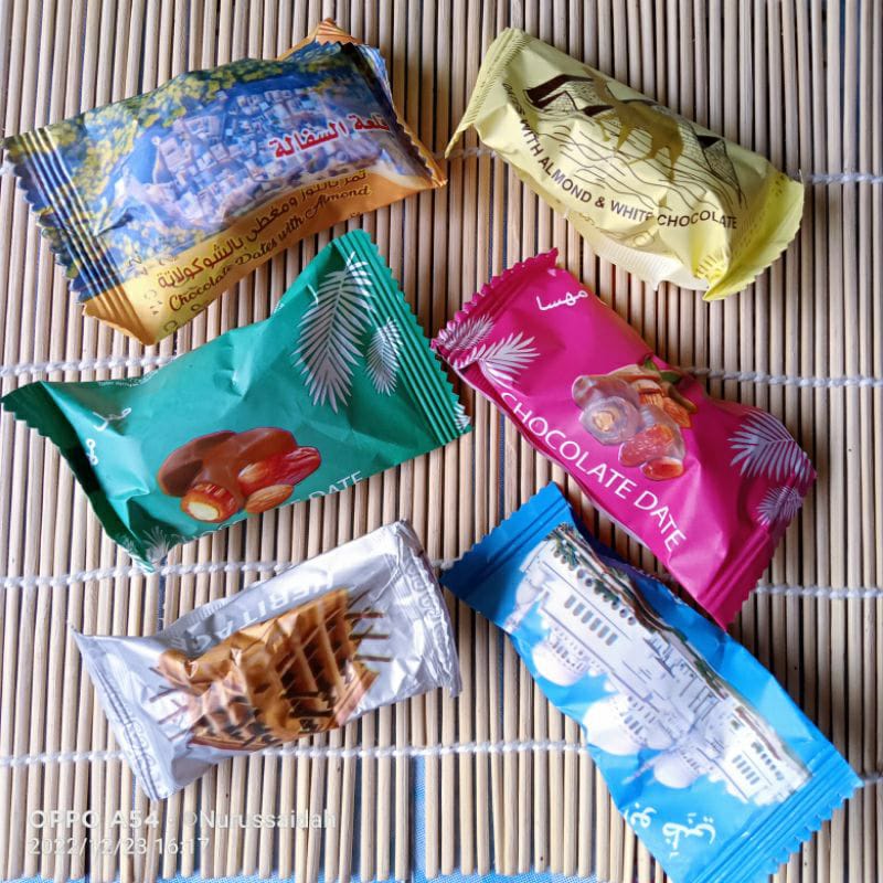 Buah Kurma, coklat, kacang mede, dan varian rasa.
