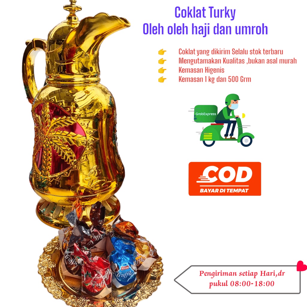 Coklat Turky Oleh oleh khas haji pengiriman mengutamakan Kualitas coklat yang di kirim selalu stok terbaru tidk bengik memiliki beberapa rasa dengan rasa mix rasa creme lumer karamel isi Cokelat lembut dengan crispy Kemasan merah muda isi creme susu strawberry dengan crispy Kemasan biru isi susu dengan crispy memiliki 2 varian kemasan 1.kemasan 1 kg 2.kemasan 500 grm pengiriman setiap hari sesuai orderan