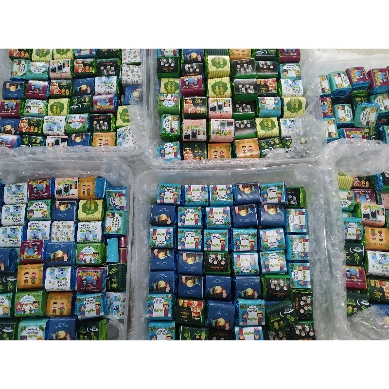 coklat dadu isi 4 biji bisa req tema idul fitri. sncak. kartun untuk wrapernya. coklat di buat dengan coklat dark compound collata dan mente cacah jd rasa pasti enak dan tidak mengendal. free amplop