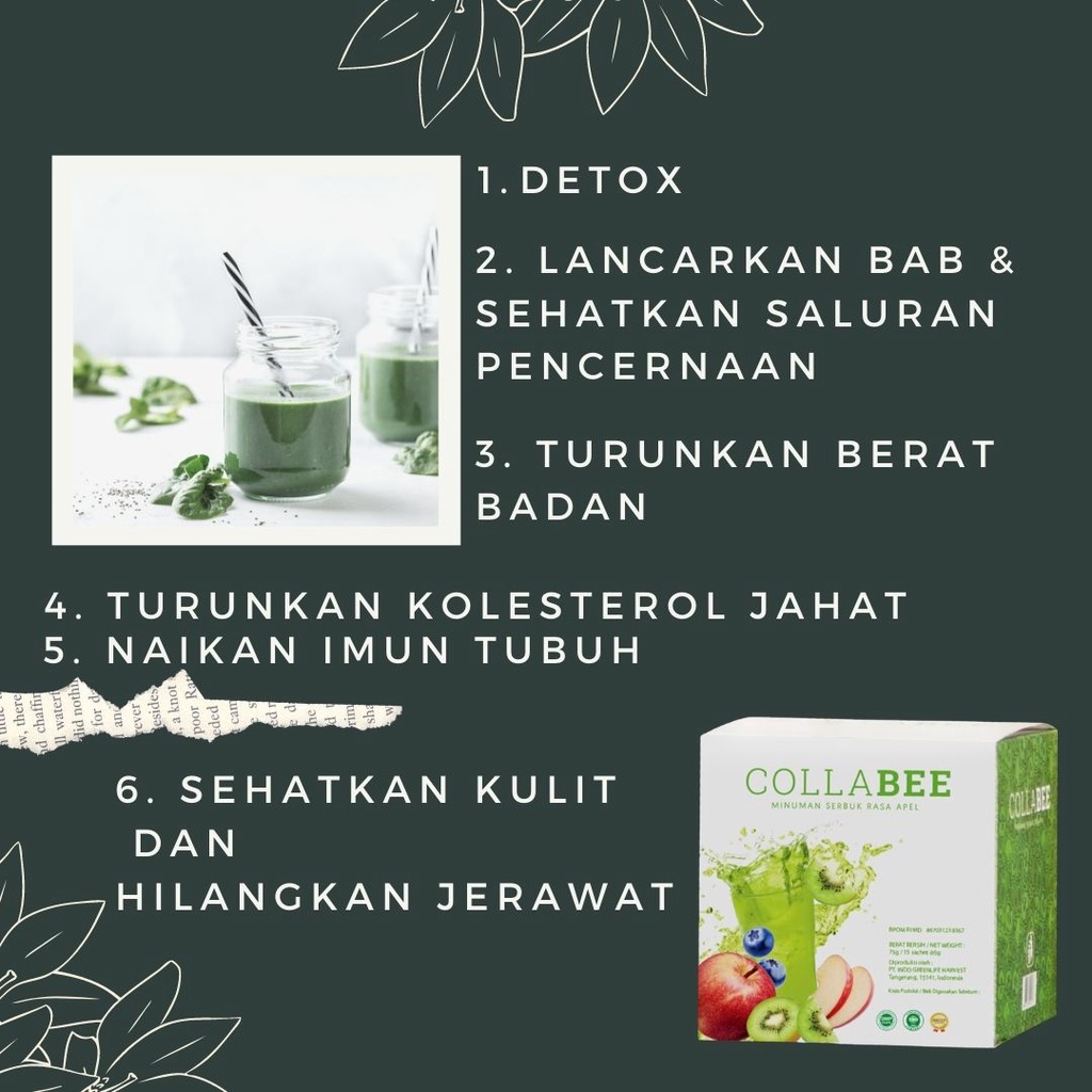 MANFAAT LAIN dari COLLABEE: 1. Memperindah kulit dan melindungi tubuh dari radikal bebas sehingga mencegah penuaan dini 2. Melancarkan BAB sehingga menjaga kesehatan pencernaan dan mencegah sembelit 3. Membantu menurunkan berat badan agar berat badan ideal 4. Mencegah terjadinya kanker usus 5. Menguatkan sistem kekebalan tubuh (antibodi) 6. Menurunkan kolesterol
