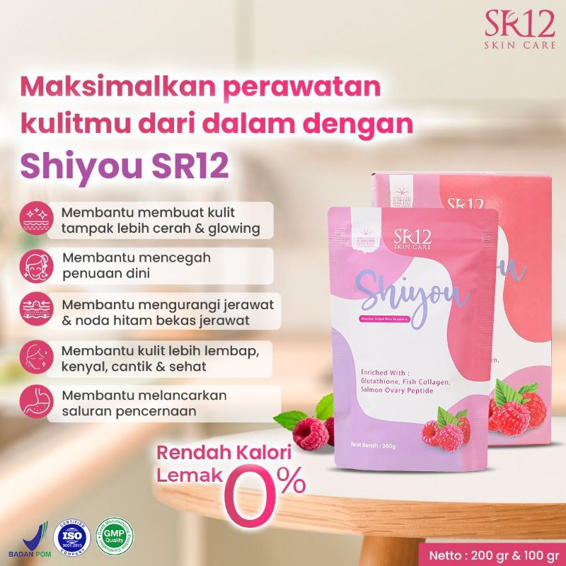 1. Apa itu SR12 Shiyou Collagen ? Merupakan minuman serbuk rasa Raspberry dengan kandungan super lengkap yakni Salmon kolagen, Glutathion, Salmon Ovary Peptide, Ekstrak Raspberry, Vitamin C dan Vitamin E