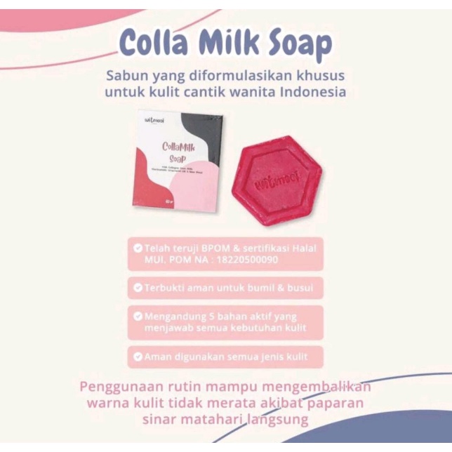 ✨Kegunaan : Witmooi CollaMilk Soap mengandung Collagen dan Goat Milk yang memelihara kelembaban dan kehalusan kulit. Diperkaya Niacinamide, Grapeseed oil sebagai brightening agent dan emollient juga Rose Petal yang kaya antioxidant. Kulit senantiasa bersih, cerah, lembab dan halus.