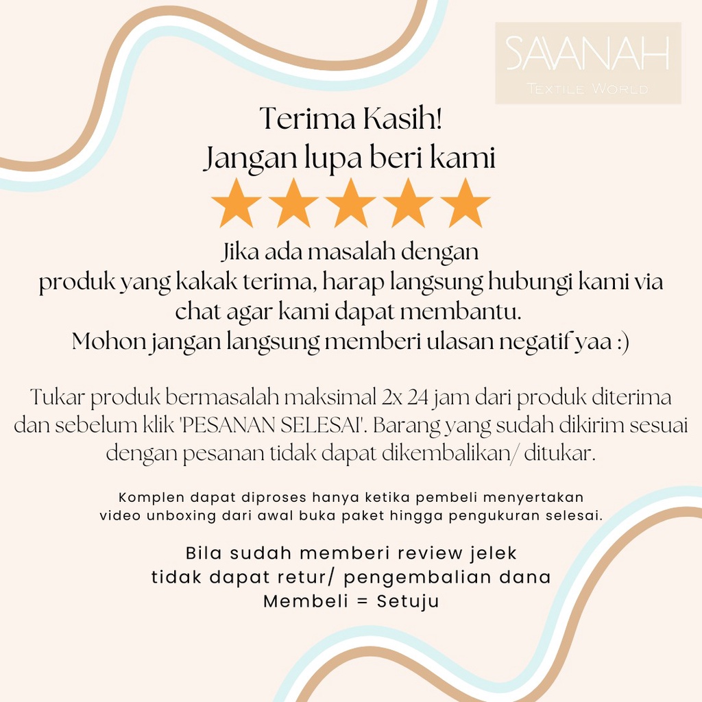 PERHATIAN: • Semua ukuran pada size chart dibuat oleh toko Savanah untuk membantu pelanggan dalam mengira-ngira ukuran kain yang diperlukan, dan toko Savanah TIDAK MENJAMIN bahwa semua ukuran yang tertulis diatas tepat untuk kebutuhan anda. Bila ingin tahu ukuran secara pasti, mohon konsultasi dulu dengan penjahit. • Request (potong dan plastikin, dll) mohon ditulis di "CATATAN UNTUK PENJUAL" saat checkout, BUKAN LEWAT CHAT. • Pengiriman hari senin-sabtu, order hari minggu akan dikirimkan pada hari Senin.