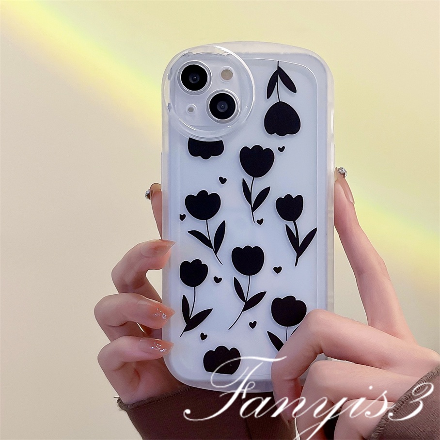 Compatible For iPhone 14 13 12 11 Pro Max X XR Xs Max 8 7 6 6s Plus SE 2020 Kompatibel Untuk Ins Bunga Hitam Casing Ponsel Lembut TPU Cover