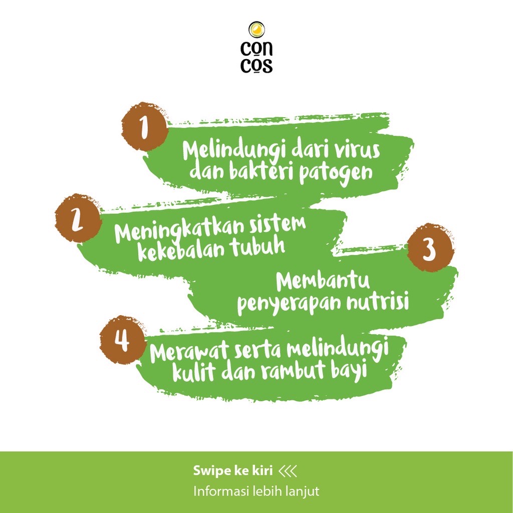 Concos Virgin Coconut Oil Kids merupakan 100% minyak kelapa murni organik dengan kandungan utama asam laurat ini memiliki sifat antibiotik, anti bakteri dan jamur. Metode esktraksi consos adalah Cold Pressesed dan tanpa pemanasan ataupun tambahan kimia.