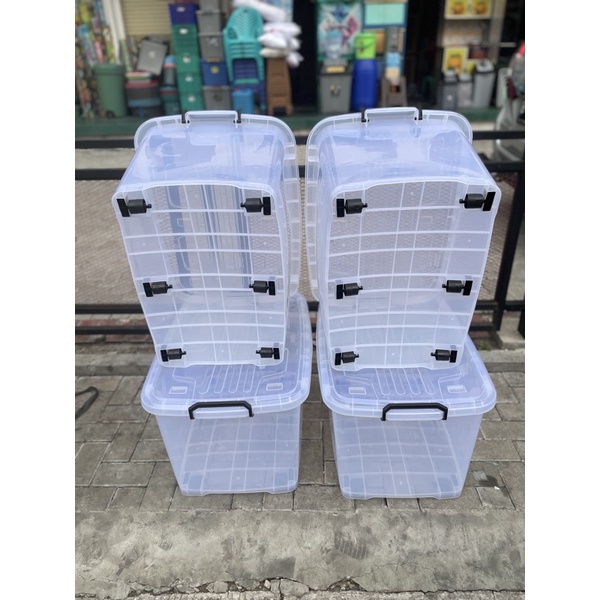 (Kuat & Tahan Banting) * Body warna Transparan / Bening (Tidak kelihatan dalam isinya) * Model baru dengan menggunakan bahan plastik yg kuat & tahan banting * System instalasi roda baru sehingga box container dipastikan rodanya tetap bisa berjalan walaupun berbeban berat
