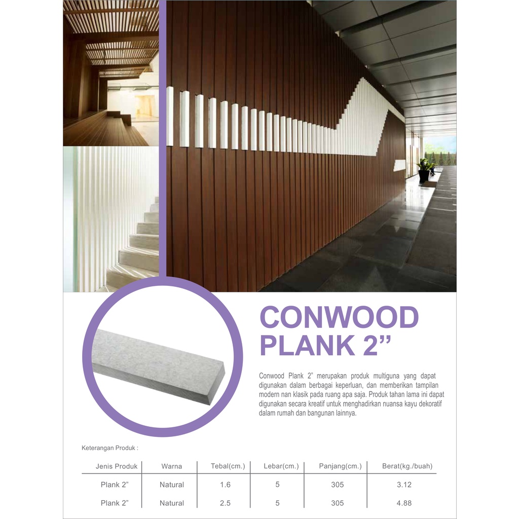 • Conwood menyediakan solusi pengganti kayu yang inovatif dengn menggabungkan keindahan dan kemudahan sebagaimana pengerjaan kayu asli dengan kekuatan dan daya tahan beton. Conwood terbuat dari semen berkualitas tinggi dengan serat daur ulang terbaik serta menggunakan teknologi terbaik dari swiss.