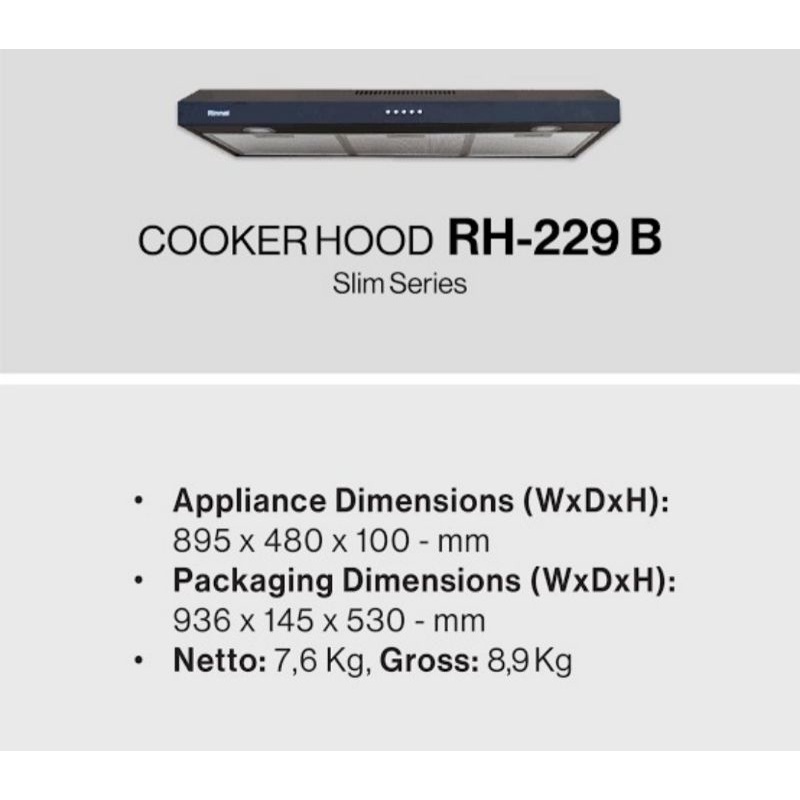 Cooker Hood Rinnai RH-229B Dapur bebas asap dan lebih nyaman. RH-229B merupakan cooker hood atau alat penghisap asap dengan body super slim, warna hitam elegan dan cantik untuk Anda yang memiliki dapur modern dan minimalis. Cooker hood ini memiliki fitur double exhaust system yang bisa diatur dan disesuaikan dengan kebutuh dapur Anda bisa recycle ataupun ventilation. Selain itu terdapat 2 charcoal filter yaitu filter penyaring bau yang mudah untuk dibersihkan dan dipasang kembali.