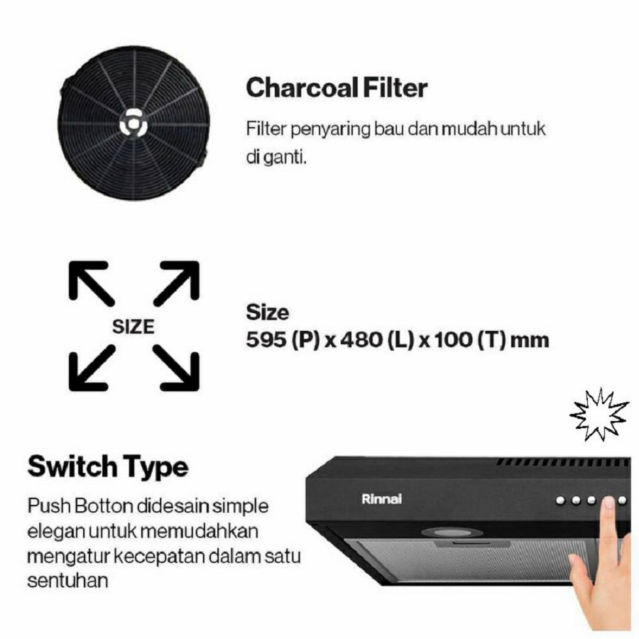 Dapur bebas asap dan lebih nyaman. RH-126B merupakan cooker hood atau alat penghisap asap dengan body super slim, warna hitam elegan dan cantik untuk Anda yang memiliki dapur modern dan minimalis. Cooker hood ini memiliki fitur double exhaust system yang bisa diatur dan disesuaikan dengan kebutuh dapur Anda bisa recycle ataupun ventilation. Selain itu terdapat 1 charcoal filter yaitu filter penyaring bau yang mudah untuk dibersihkan dan dipasang kembali.