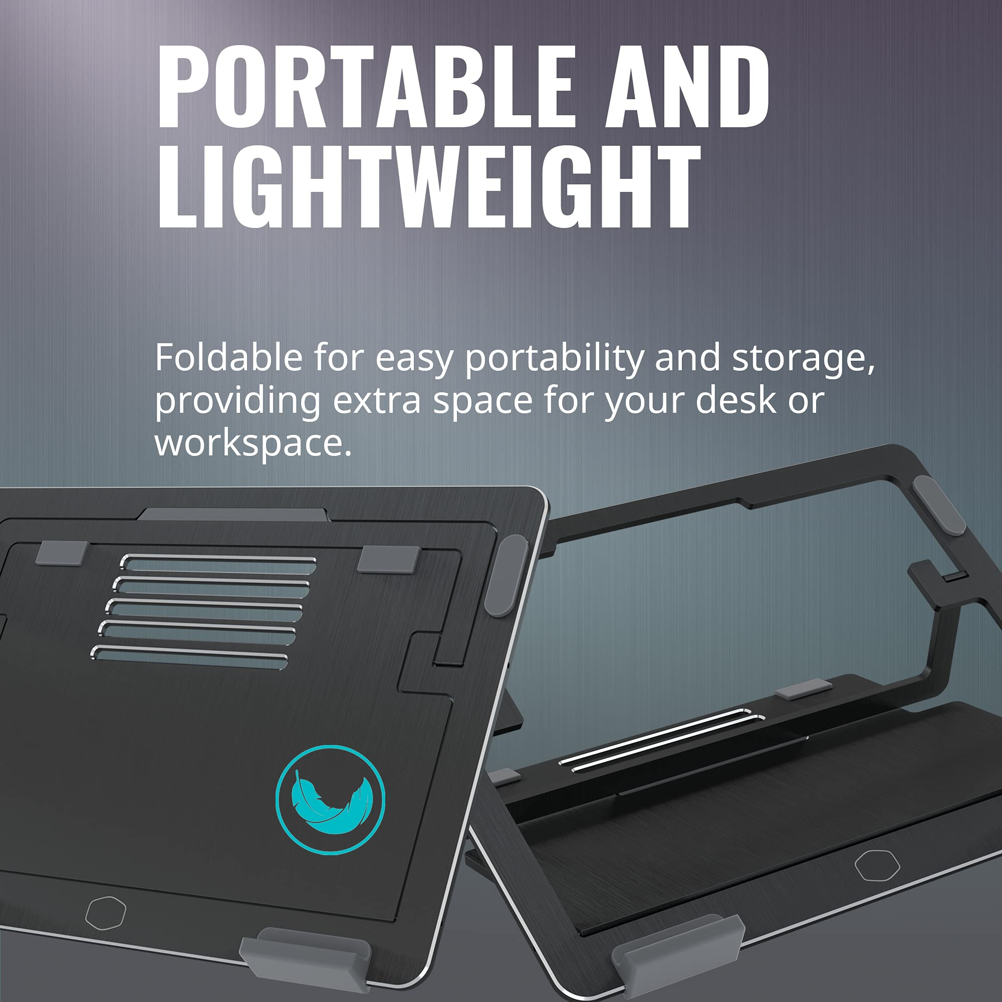 ALUMINUM ALLOY Dibangun dengan paduan aluminium padat 4mm untuk struktur portabel dan ringan, dukungan laptop atau tablet hingga 15".