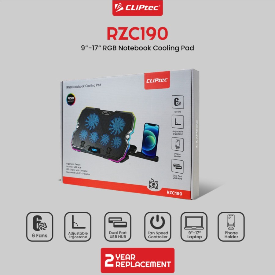 CLIPtec RZC190 RGB Notebook Cooling Pad untuk Laptop ukuran 9" - 17" dengan design ergonomis dan dilengkapi dengan 10 Mode RGB Illumination serta memiliki phone holder untuk meletakkan smartphone dan LED Display yang dilengkapi dengan kontroler untuk mengatur kecepatan kipas.