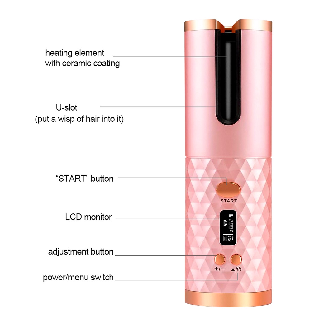 Feature: ✔️Intelligent Automatic Curling: The auto rotating ceramic hair curler is the ideal solution for your hair style at home. No skill is required and no need for multiple curling tubes. The lasting and elegant curls of this cordless curling iron are created easily and helps you own an impressive appearance. The heatless hair curlers also has inimitable heat isolating curl chamber to protect your hands. The cordless hair curler will automatically shut down after 60 minutes of use for safer. ✔️No Charging Problem: The ceramic instance wave curling iron is designed with 5200mAh battery. It can be used for 2-4 hours after fully charged. Your curls can be made according to your need in only about 10 minutes by electric hair curler, brings a perfect and satisfied experiences for ladies and friends. ✔️ Convenient and more effective: The automatic curling artifact has heater which makes the titanium straighteners heat up quickly; therefore, chargeable hair curler can achieve a better result and save more time than the normal hair iron straighteners. This twirl hair curler is equipped with 360-degree automatic roller helps you rotate automatically at one click. No more worries about tangling while straightening and curling. ✔️ 6 Timer Settings and LCD Screen: The USB curling wand for hair styling can be automatically heated from 150 to 200 degrees. The cordless magic curling also has 6 timer settings from 8 to 18 seconds. You can choose the level which is suitable with your hair. The low level is highly recommended for the first use. It can be seen on the LCD screen. ✔️Easy to Carry: The roller hair electric is small and elegant. This automatic curling iron cordless can be recharged by USB charger, power bank, Laptop or car charger. The hair auto curler is easy to carry for travel and business trips, helps you create beautiful natural hair wherever you want.