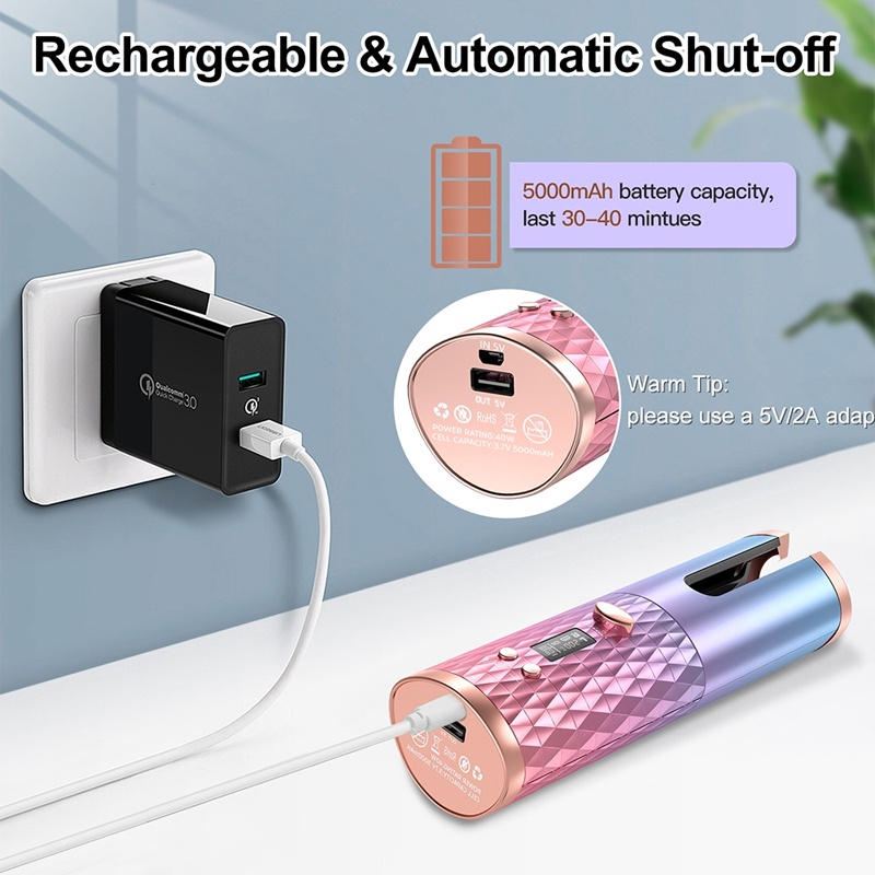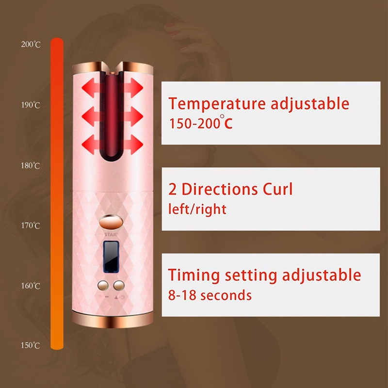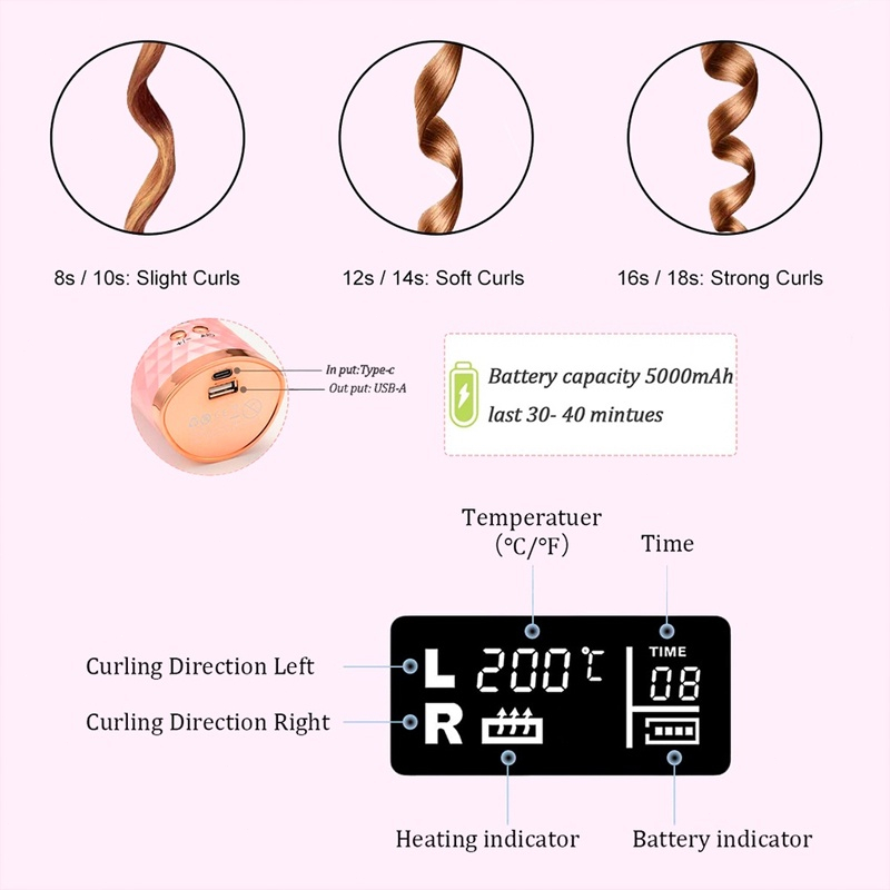 Feature: ️Intelligent Automatic Curling: The auto rotating ceramic hair curler is the ideal solution for your hair style at home. No skill is required and no need for multiple curling tubes. The lasting and elegant curls of this cordless curling iron are created easily and helps you own an impressive appearance. The heatless hair curlers also has inimitable heat isolating curl chamber to protect your hands. The cordless hair curler will automatically shut down after 60 minutes of use for safer. ️No Charging Problem: The ceramic instance wave curling iron is designed with 5200mAh battery. It can be used for 2-4 hours after fully charged. Your curls can be made according to your need in only about 10 minutes by electric hair curler, brings a perfect and satisfied experiences for ladies and friends. ️ Convenient and more effective: The automatic curling artifact has heater which makes the titanium straighteners heat up quickly; therefore, chargeable hair curler can achieve a better result and save more time than the normal hair iron straighteners. This twirl hair curler is equipped with 360-degree automatic roller helps you rotate automatically at one click. No more worries about tangling while straightening and curling. ️ 6 Timer Settings and LCD Screen: The USB curling wand for hair styling can be automatically heated from 150 to 200 degrees. The cordless magic curling also has 6 timer settings from 8 to 18 seconds. You can choose the level which is suitable with your hair. The low level is highly recommended for the first use. It can be seen on the LCD screen. ️Easy to Carry: The roller hair electric is small and elegant. This automatic curling iron cordless can be recharged by USB charger, power bank, Laptop or car charger. The hair auto curler is easy to carry for travel and business trips, helps you create beautiful natural hair wherever you want.