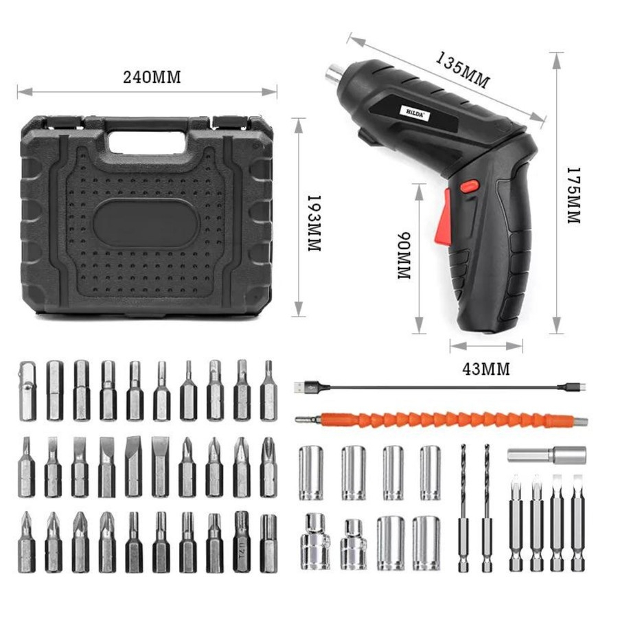 Isi Kemasan : 1* Obeng Listrik Tanpa Kabel 1* Kabel USB 1* Buku Paduan 47* Mata Bor
