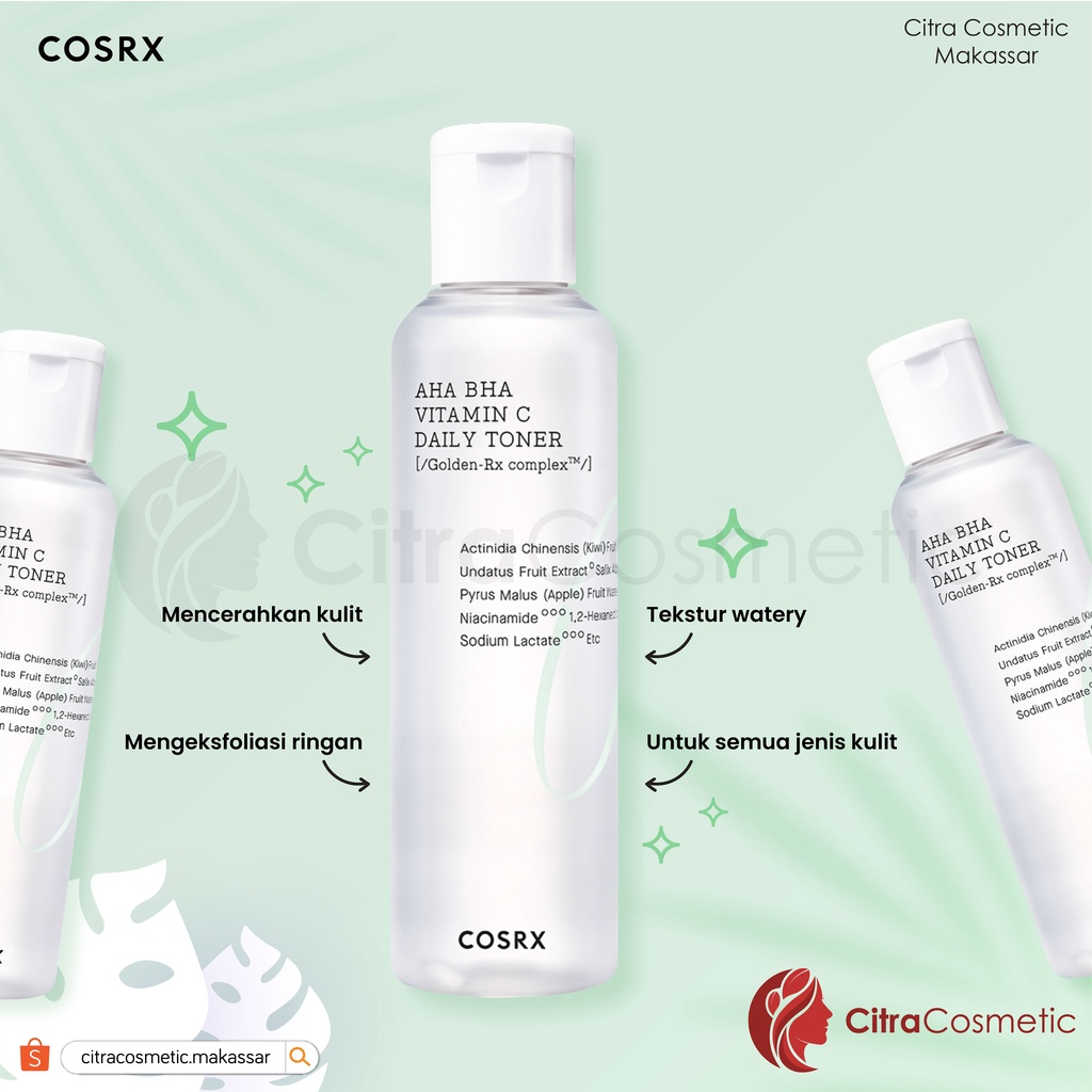 Toner keluaran COSRX ini merupakan toner dengan kombinasi unik yang mematahkan berbagai stereotype dan rumor tentang vitamin C yang tidak bisa dicampur dengan AHA, BHA, dan niacinamide. Toner dalam botol transparan ini menggunakan GOLDEN-RX COMPLEX™ yang merupakan campuran dari ekstrak buah kiwi dengan ekstrak buah hylocereus undatus.Turunan vitamin C yang digunakan dalam toner ini adalah ascorbyl acid. Sedangkan AHA yang digunakan adalah glycolic acid yang merupakan exfoliator dan BHA yang digunakan adalah betaine salicylate yang bersifat antibakteri.Seperti nampak dalam kandungannya, produk ini merupakan exfoliator toner yang akan mengangkat sel kulit mati, memperbaiki tekstur kulit, dan membuat kulit lebih cerah dengan kandungan niacinamide-nya. Memiliki tekstur cair, toner ini mudah diserap ke dalam kulit dan sudah teruji secara dermatologis aman untuk kulit sensitif. Kandungannya juga bebas alkohol, paraben, sulfat, mineral oil, tambahan pewangi, serta bersifat hypoallergenic.