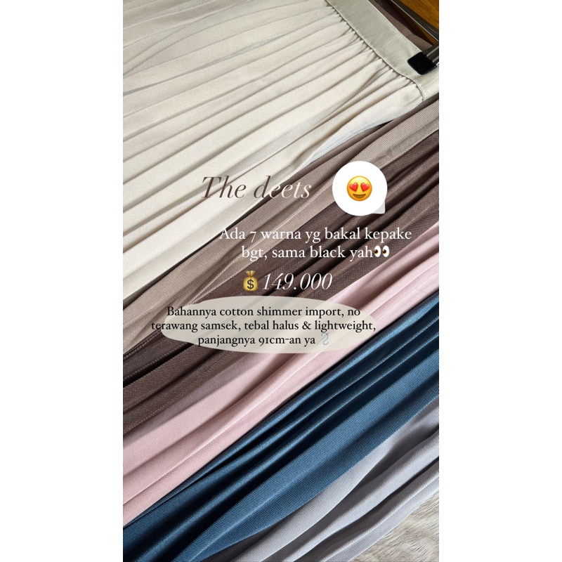 tebal, halus, lightweight, tidak terawang, tidak kusut, plisket ralih dan konsisten, karet rok premium dan super stretch melarnya. ALLSIZE (semua bb masuk) panjang -+ 91cm 💰149.000