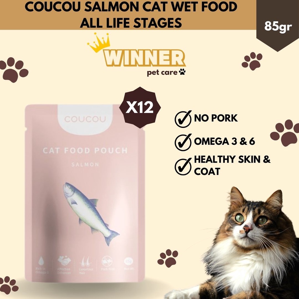 COUCOU Pouch Wet Cat Food 85g, makanan kucing basah dalam bentuk pouch sekali makan yang praktis bahkan untuk dibawa bepergian. Terdiri dari tiga varian rasa, Chicken, Tuna dan Salmon untuk kucing kesayanganmu. Terbuat dari air dan 98% daging berkualitas, kaya akan kandungan asam amino dan vitamin.