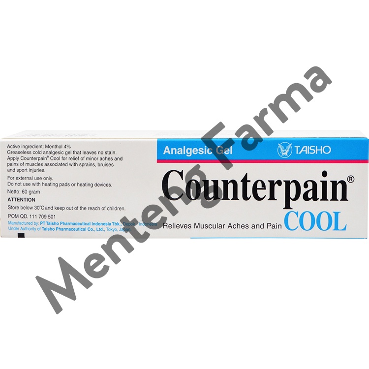 Counterpain Cool merupakan gel analgesik yang berkhasiat untuk membantu meringankan rasa sakit pada otot karena olahraga, keseleo, memar, atau nyeri punggung. Counterpain Cool mengandung zat aktif Menthol yang lebih banyak dari Counterpain biasa, dimana Menthol dapat memberikan sensasi rasa dingin kemudian menjadi hangat sehingga dapat mengalihkan rasa nyeri di bagian tubuh yang sakit.