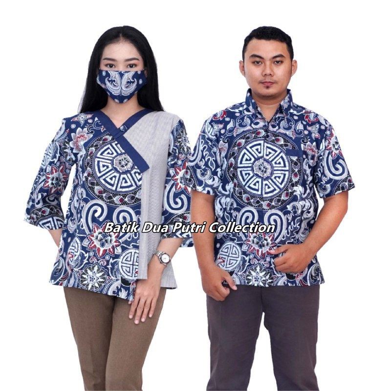 Pakaian Wanita > Pakaian Tradisional > Set Pakaian Tradisional > Couple Batik Atasan Wanita Kemeja Pria Warna Biru Kombinasi Salur By Batik Dua Putri Collection