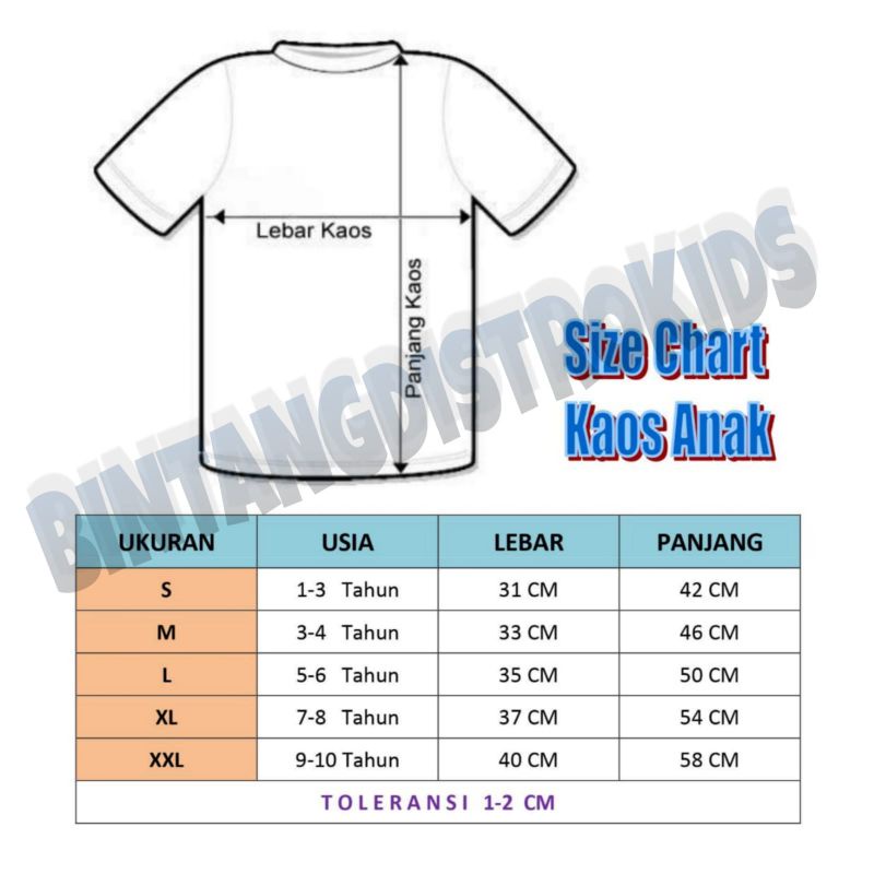 Spesifikasi ukuran Lebar Dada x Panjang Bawah dan usia: 👉Size S = LD 31cm PB 42cm Usia 1-2 th 👉Size M = LD 33cm PB 46cm Usia 3-4 th 👉Size L = LD 35cm PB 50cm Usia 5-6 th 👉Size XL = LD 37cm PB 54cm Usia 7-8 th 👉Size XXL = LD 40cm PB 58cm Usia 9-10 th
