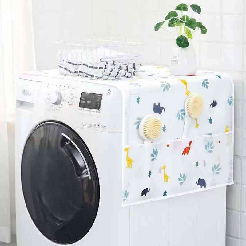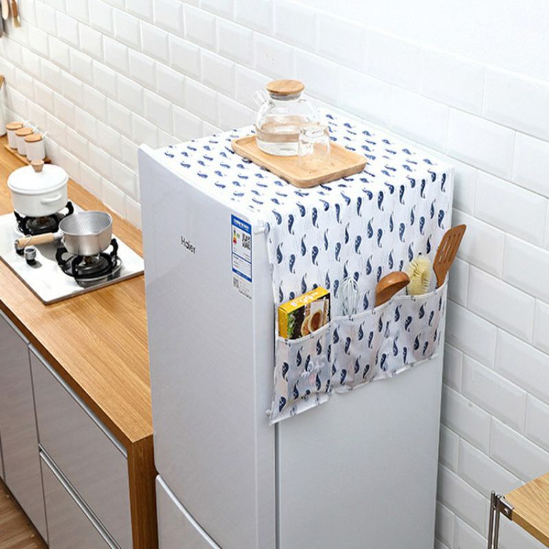 Penutup bagian atas kulkas berfungsi sebagai pelindung dari debu / kotoran, agar kulkas bagian atas tidak baret/ tergores. Juga berfungsi sebagai dekorasi yang dilengkapi dengan kantong (3 kantong masing2 sisi) untuk menaruh barang2 keperluan dapur. Mudah dicuci jika terkena noda karena bahan waterproof