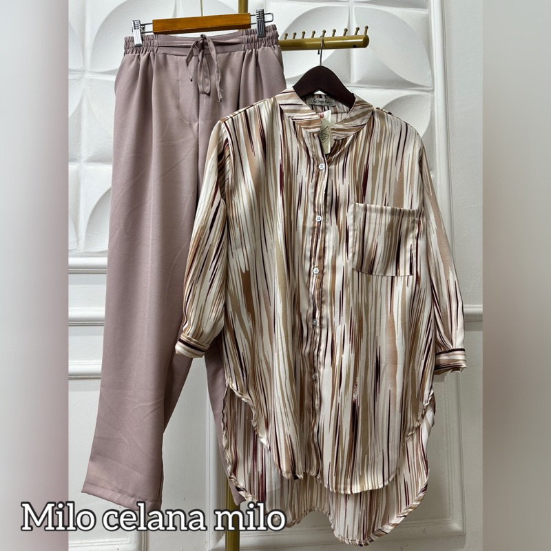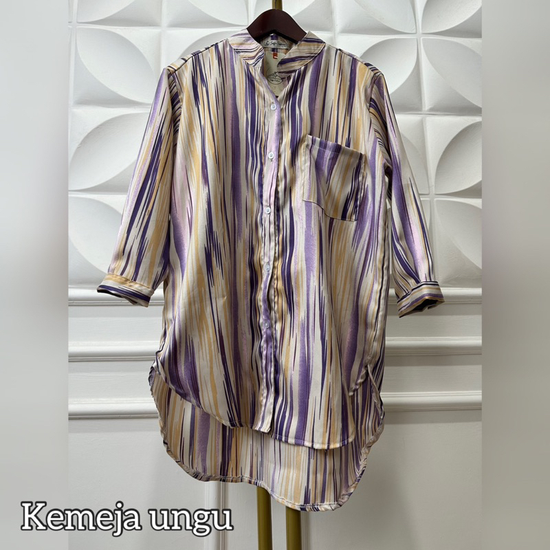 Coza Setelan Wanita Amora Set Kemeja Motif Salur Garis Lurik Abstrak Bahan Syakila Premium Size Standar Dan Jumbo XXXl 100kg Lengan panjang Setrip