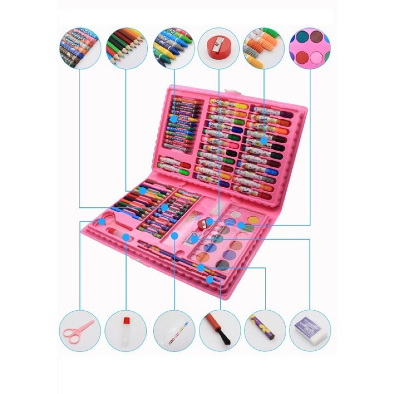 PILIHAN ISI 86 : Isi Dalam Kotak SET 86 pcs: - Colour Pen Cair 24pcs - Pensil Warna Kayu 12pcs - Crayon Tajam 12pcs - Crayon Tumpul 12pcs - Cat Warna 12pcs - Peraut 1pcs - Penghapus 1pcs - Lem Cair 1pcs - Pensil 1pcs - Sponge 1pcs - Penggaris 1pcs - Kuas Warna 1pcs - Paper Clip 5pcs - Gunting Plastik 1pcs - Tempat Cat Warna 1pcs