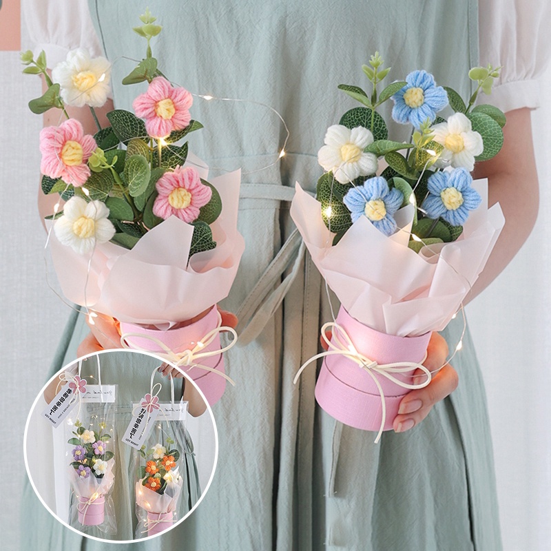 Crochet Anyaman Flowers Bouquet Bunga Rajut Dengan Lampu LED String Hadiah Tamu Pernikahan Pot Tanaman Bunga Dekorasi Rumah