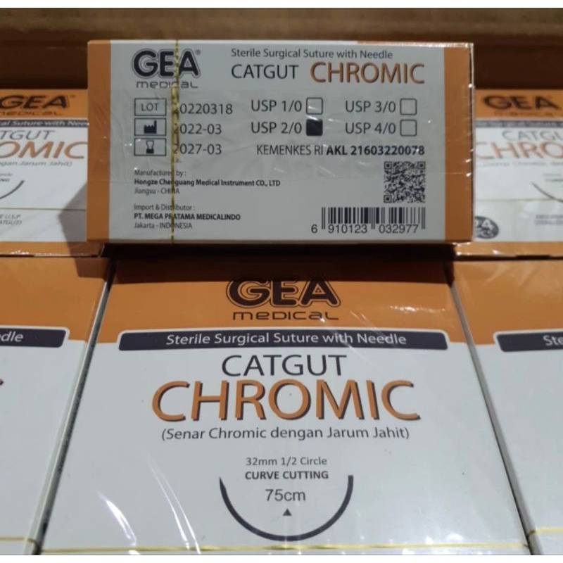 * Merk : GEA Medical * Panjang : 75cm, 32mm 1/2 circle CURVE CUTTING * Harga : 1 box isi 24 sachet * Benang Chromic dikemas dengan 89% Isopropanol, 10% air dan 1% larutan Triethanolamine * Benang di proses dengan larutan garam chromic * Diindikasikan untuk digunakan dalam jaringan lunak atau litigasi umum, termasuk penggunaan operasi mata, tetapi disarankan untuk penggunaan pada bedah kardiovaskular atau neurologi * Kemasan steril