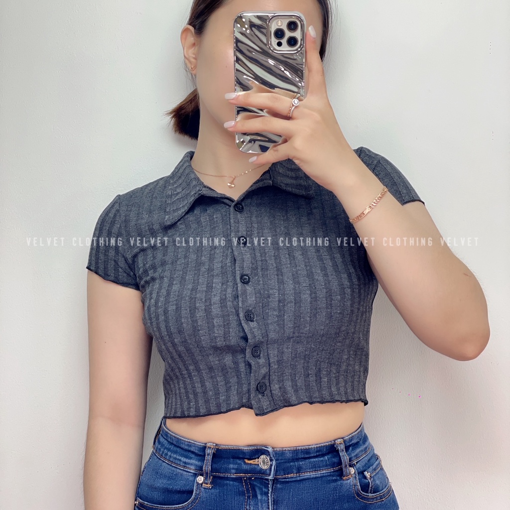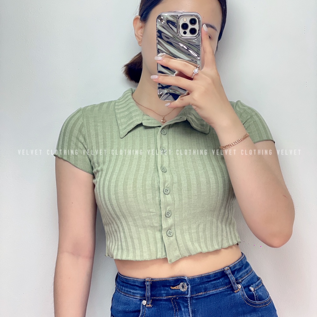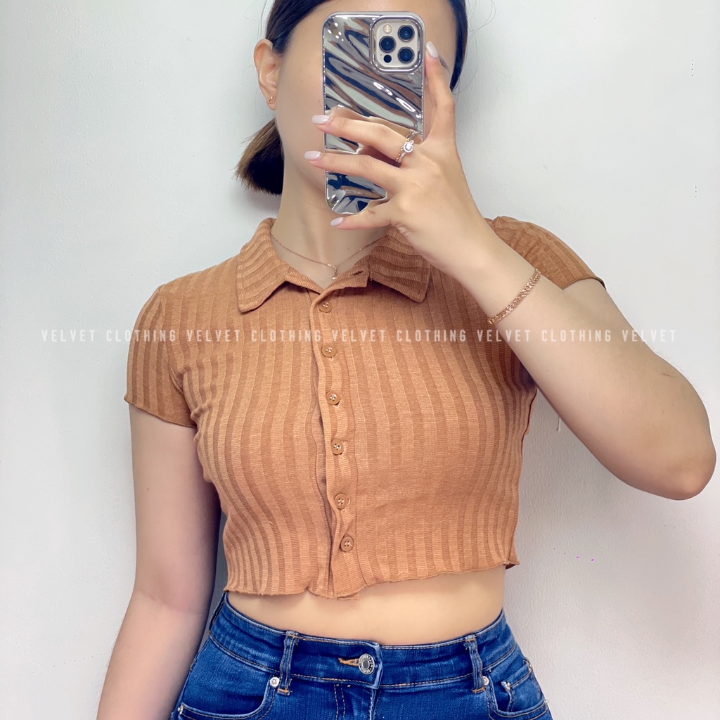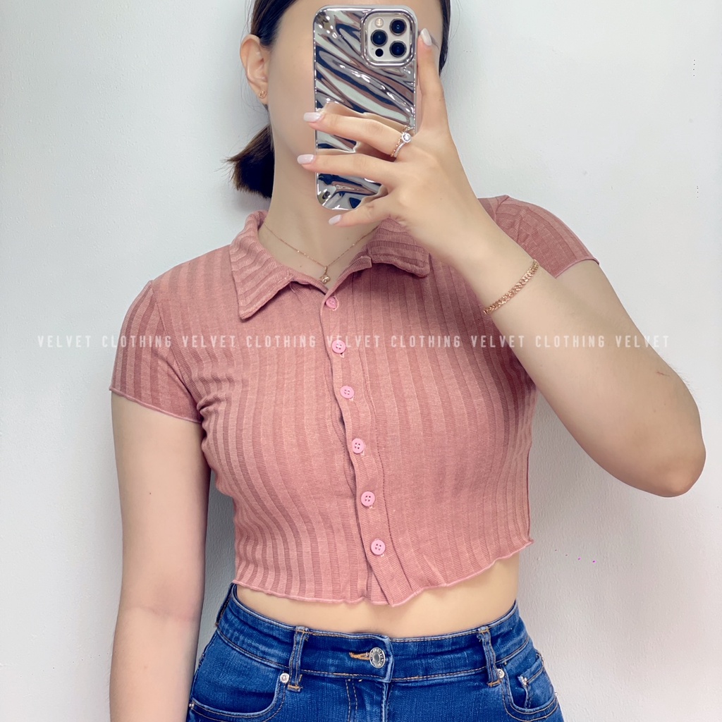 Detail Crop Top Kerah Kancing Rib Knit / Crop Top Button Wanita / Crop Top Rib Kancing 4697