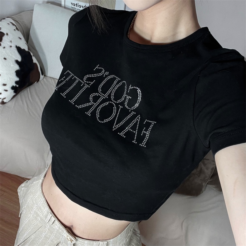 Detail ◄cropped top American hot girl hot diamond letter fried street T-shirt female ins style net red slimming all-match crop top #COD