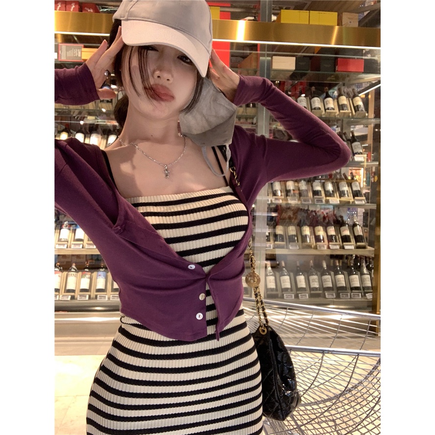 Detail ❒Cropped top lengan panjang kardigan tabir surya rajutan top pinggang tinggi bergaris gaya Korea slim suspender dress suit musim panas wanita #COD