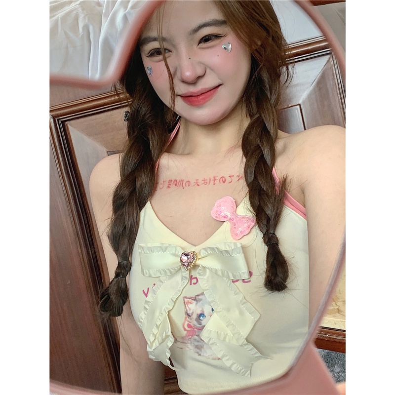 Pakaian Wanita > Denim > Atasan Denim > ☋☸cropped top sweet and spicy cat print butterfly heart open back halter neck top women s short suspenders for summer #COD